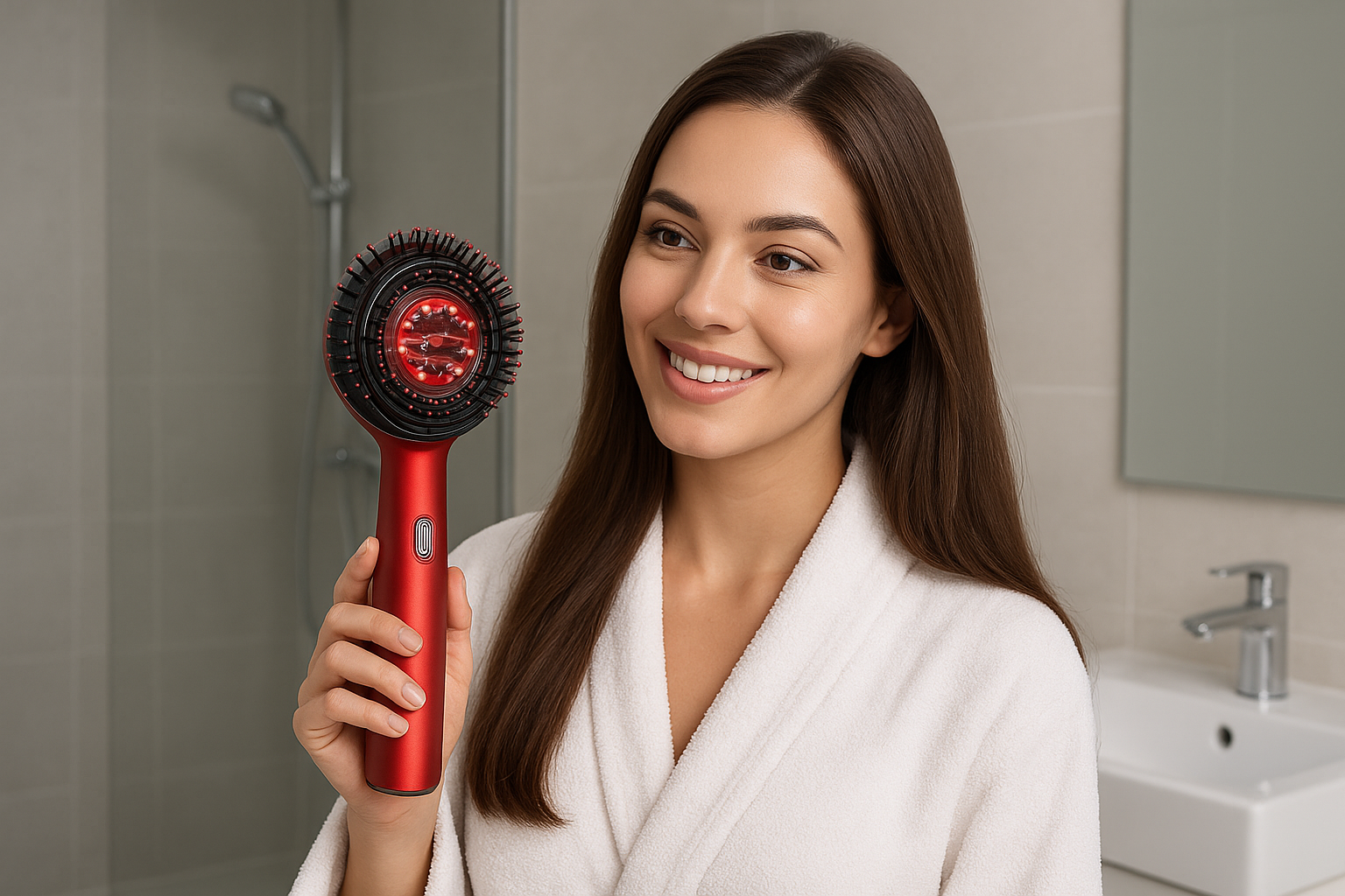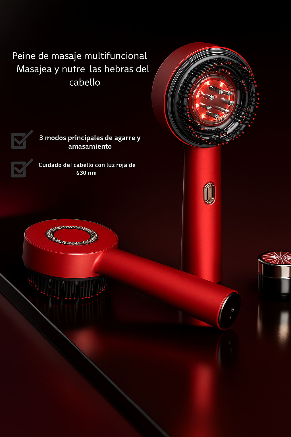 Peine de masaje capilar inteligente con tecnología de microcorriente y luz roja de 630 nm que revitaliza el cuero cabelludo y fortalece las raíces.